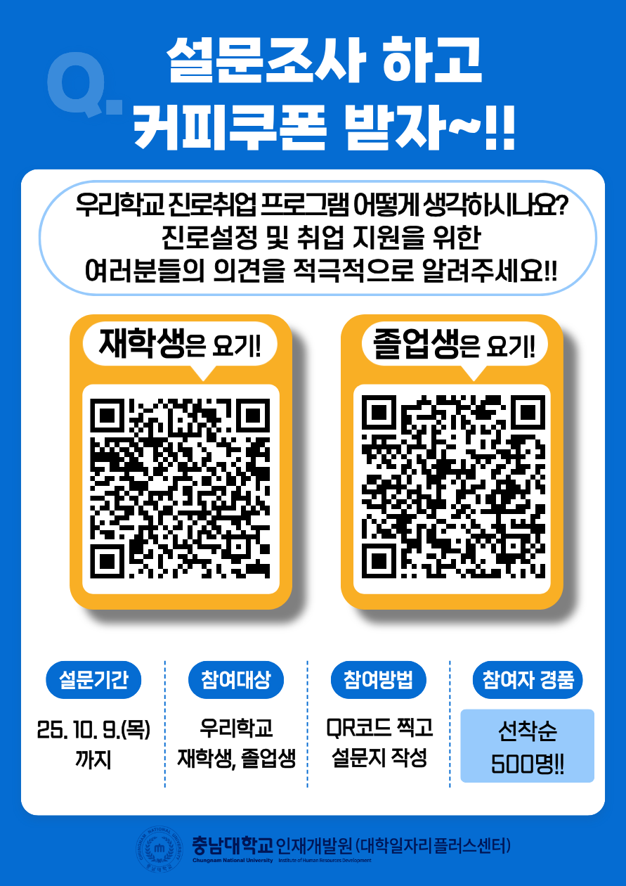 [인재개발원] (기간연장)「2025년 충남대학교 진로취업 서비스 향상을 위한 조사」 | |||||